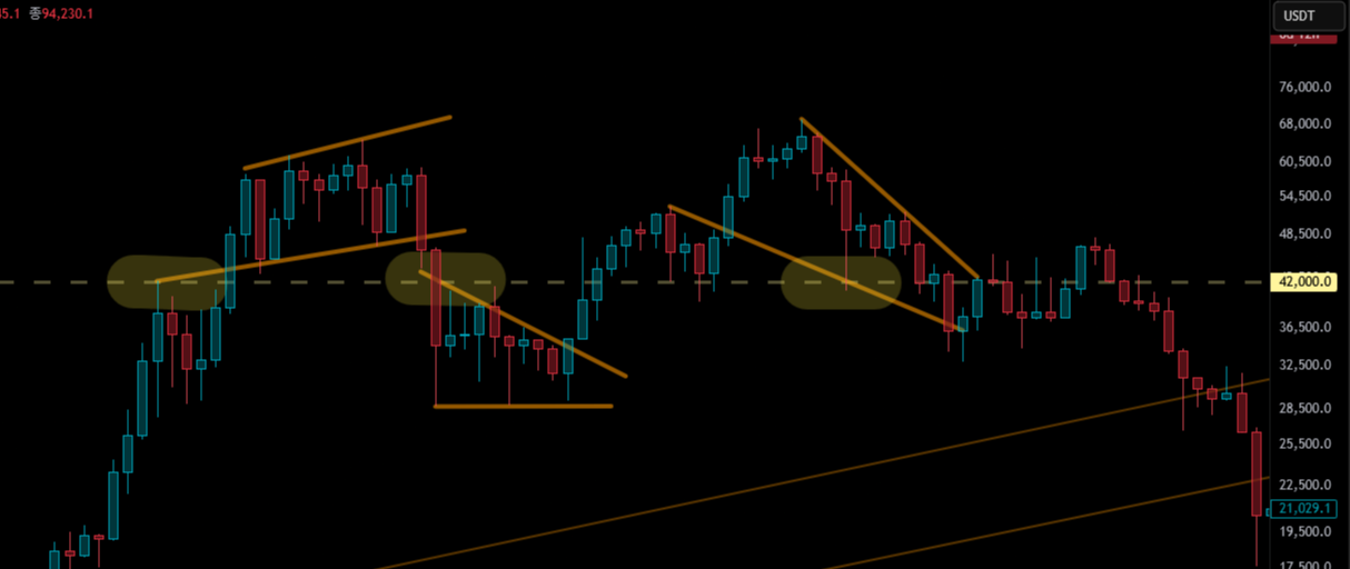 그러나 이 두 지표는 자주 겹친다. 2021년 비트코인 $42,000 지점은 추세선과 자주 겹치며 상당량이 거래된 대형 매물대로 기록됐다. 우연일까? 아니다. 같은 지점에서 반복적으로 거래량이 터졌기 때문에 고점과 저점이 형성되었고 그렇게 매물대 지표에도 두꺼운 막대가 생겼다. 가격 궤적과 거래 에너지가 하나의 좌표 위에 중첩된 결과다. 겹쳤다고 해서 추세선이 매물대를 포함하거나, 반대로 매물대가 추세선을 생성한 것은 아니다. 원인은 동일해도 측정 방식이 다르기 때문에 둘은 병렬적이다.